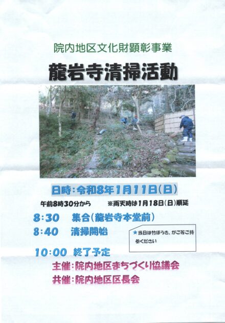 龍岩寺清掃活動 2025 12/30 事業・催し物のご案内 令和7年度 2025-12-30 院内地区文化財顕彰事業 『龍岩寺ふれあい清掃活動』 院内地区文化財顕彰事業 『龍岩寺ふれあい清掃活動』日時 令和 8年 1月 11日 (日) 8:30集合 雨天時は 1月18日(日)に順延集合場所 龍岩寺 本堂前 午前10時すぎには終了を予定しています。 事業・催し物のご案内 令和7年度 よかったらシェアしてね! URLをコピーしました! URLをコピーしました! 龍岩寺石楠花植栽周辺草刈り作業 龍岩寺清掃活動 関連記事 龍岩寺清掃活動 2026-01-11 龍岩寺石楠花植栽周辺草刈り作業 2025-09-30 院内地区まちづくり協議会だより第51号 2025-08-30 令和7年度防災講習会 2025-08-25 令和7年度岳切渓谷 紅葉ウォーキング 2025-08-25 令和7年度院内地区 防災講習会 2025-08-20 子供の広場の七夕まつり 2025-07-03 令和7年 上院内でホタル見ナイト 2025-06-20
